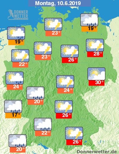 Zum Start in die neue Woche herrscht in Deutschland wechselhaftes Sommerwetter mit zeitweiligem Sonnenschein und oft auch dichten Wolken, bevorzugt nachmittags bilden sich vielerorts Schauer und auch lokale Gewitter. Die Temperatur steigt auf 17 Grad im Saargau und bis 30 Grad in der Lausitz.