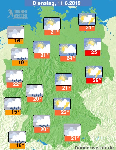 Am Dienstag ist es besonders über der Westhälfte meist dicht, teils auch aufgelockert bewölkt und es fällt gebietsweise Regen. Weiter nach Osten hin scheint neben teils dichte Quellwolken auch häufig die Sonne, es können sich jedoch einzelne Schauer und Gewitter bilden. Die Temperatur erreicht 15 Grad am Pfälzer Wald und bis 26 Grad in Dresden.