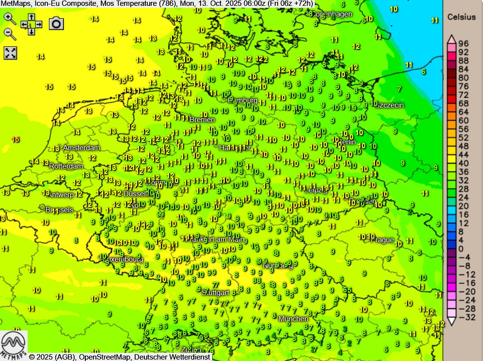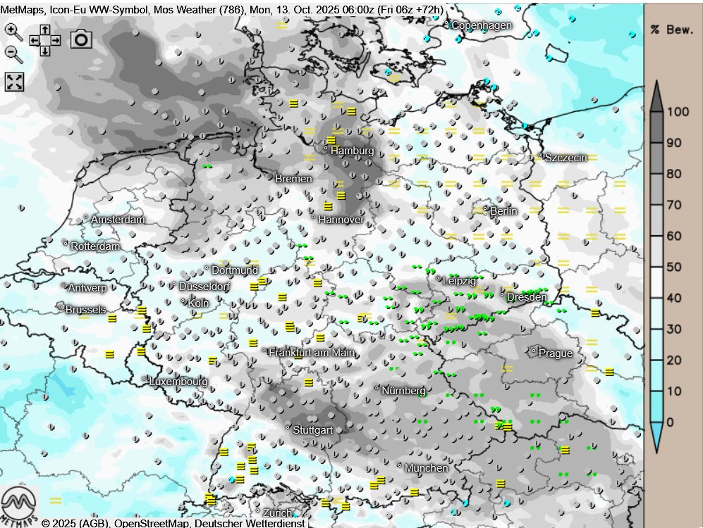 Die Strömungs- und Temperatur- sowie die Wetterkarte für Montagfrüh (06:00 Uhr) nach Icon-Eu: