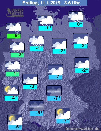Die Luft kühlt bis zu den Frühstunden auf frostige -7 bis 0 Grad ab. Über Schneeflächen kann es bei aufklarendem Himmel noch kälter werden. Lediglich in den Ballungsgebieten des Westen, sowie im westlichen Niedersachsen bleibt es in der Regel frostfrei.