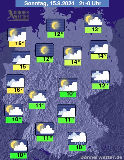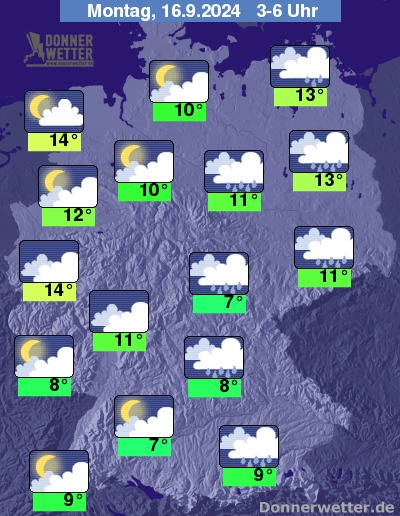 In der Nacht zum Montag ist der Himmel auf einer Linie vom nördlichen Mecklenburg-Vorpommern bis in den Süden Bayerns stark bewölkt oder bedeckt; dabei fällt verbreitet Regen, der im Nachtverlauf bis in die Landesmitte vorankommt. Westlich davon bleibt es bei wechselnder Bewölkung weitgehend trocken.