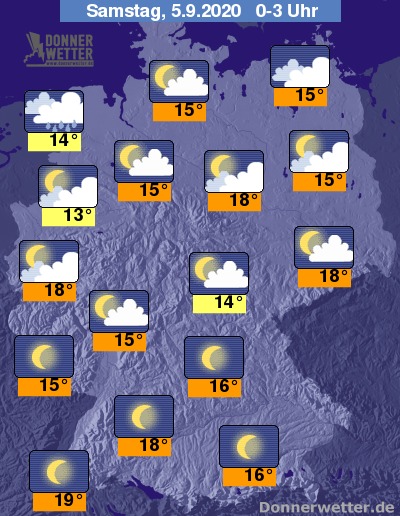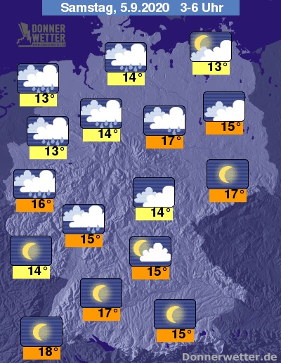 Bis zu den Frühstunden kühlt die Luft auf 18 bis 13 Grad ab, am mildesten bleibt es im Breisgau und in Sachsen.