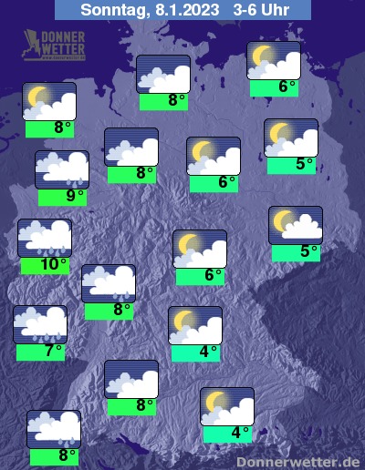 In der folgenden Nacht ziehen in den westlichen Landesteilen kompakte Wolken auf und es setzt hier verbreitet Regen ein. Im übrigen Land bleibt es teils aufgelockert, zunehmend wird es jedoch stark bewölkt, jedoch bleibt es trocken. Die Temperatur sinkt auf 10 Grad in Köln und 4 Grad in München.