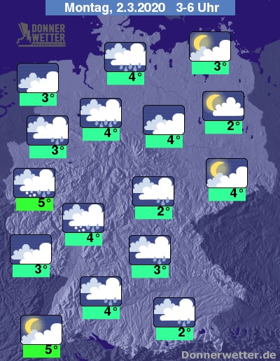 In der Nacht zum Montag ziehen dichte Wolken aus Westen kommend weiter bis in die östlichsten Landesteile, dazu fällt zeitweise Regen, zum Teil auch Schneeregen oder Schnee. Die Temperatur sinkt auf 5 Grad am Rhein und bis etwa 2 Grad an der polnischen Grenze.