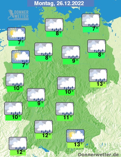 Heute ziehen überwiegend dichte Wolken durch, teilweise sind auch Auflockerungen möglich. Von Westen her zieht zeitweise Regen durch. Die Temperatur steigt auf 7 Grad an der Ems und bis 13 Grad im Berchtesgadener Land. Im Süden und an den Küsten weht ein stärkerer und oft stürmischer Wind.