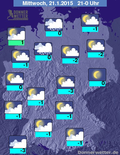 In der Nacht zum Donnerstag klingen letzte Schneefälle im Norden und Nordwesten meist rasch ab, anschließend ist es hier wie bereits schon in den anderen Regionen überwiegend aufgelockert, gebietsweise auch nur leicht bewölkt und trocken. Im Südwesten des Landes bleiben die Wolken weitgehend dicht, aber auch hier ist es trocken. Die Temperatur sinkt auf 0 Grad an der Neiße und bis -4 Grad am Thüringer Schiefergebirge.