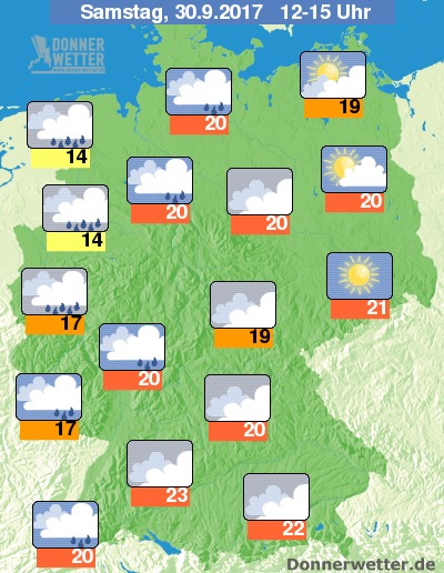Heute Nachmittag scheint von Vorpommern bis nach Sachsen noch verbreitet die Sonne, über der übrigen Osthälfte Deutschlands ist es meist stark bewölkt, jedoch ebenfalls weitgehend trocken. Weiter nach Westen hin fällt unter dichten Wolken immer wieder, teils kräftiger und ergiebiger Regen, zudem sind örtlich Gewitter möglich. Die Temperatur liegt bei teils nur 14 Grad an der Ems und bis 22 Grad in München.