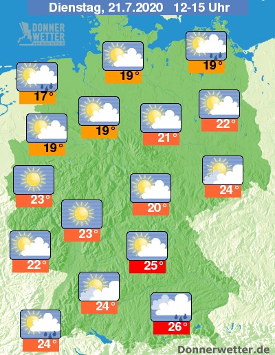 Am frühen Nachmittag können vom Bayerischen Wald bis zum südlichen Schwarzwald in schwül-warmer Luftmasse aus mächtigeren Wolkentürmen örtliche Regengüsse und Gewitter auftreten. Auch an den Küsten sind leichtere Schauer möglich. Im übrigen Land gibt es eine freundliche und trockene Mischung aus Sonne und Wolken. Regional strahlt die Sonne auch für längere Zeit.