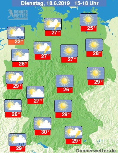 Die Temperaturen liegen allgemein zwischen 25 und 28 Grad, etwas kühler bleibt es an der Nordsee, sowie auf den Gipfeln der Mittelgebirge.