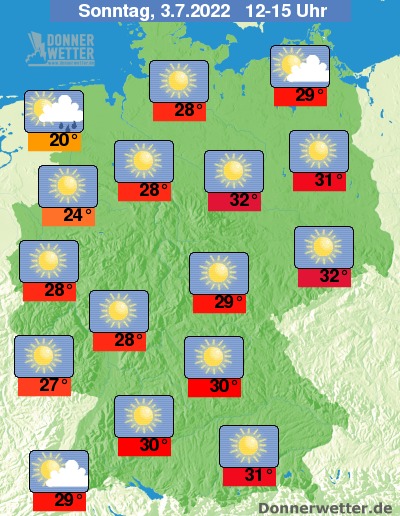 Heute Nachmittag ist es verbreitet heiter bis sonnig, gebietsweise ziehen auch ein paar Wolken durch. Im Nordwesten bilden sich vereinzelt auch Schauer oder Gewitter, während es im übrigen Land weitgehend trocken bleibt. Die Temperatur liegt bei 20 Grad an der Nordsee und etwa 32 Grad in der Lausitz.