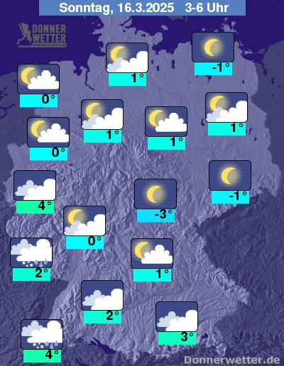 In der Nacht zum Sonntag fällt im Süden bei starker Bewölkung noch etwas Regen, Schneeregen oder Schnee. In den übrigen Landesteilen ist es sternenklar oder nur gering bewölkt, gebietsweise kann sich im Nachtverlauf Nebel bilden.