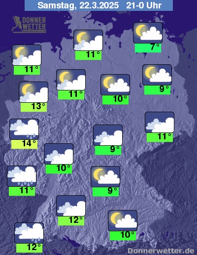 Am Samstagnachmittag scheint die Sonne von der Nordseeküste bis nach Ostsachsen von einem wolkenlosen Himmel. In den übrigen Landesteilen ist es meist heiter bis wolkig, in der West- und Südwesthälfte ist es auch stark bewölkt. Hier muss mit einzelnen Schauern oder leichtem Regen gerechnet werden. Im Südwesten sind zudem lokale Gewitter möglich.