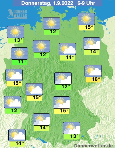 Die Temperaturen erreichen in den Frühstunden Werte um 11 Grad im Münsterland und 16 Grad in der Sächsischen Schweiz.