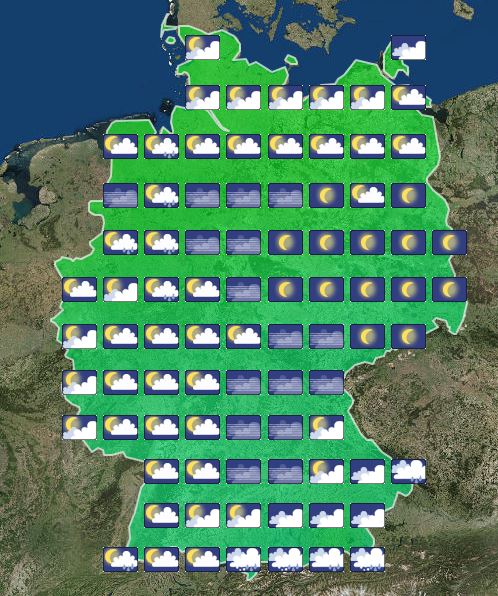 In der Nacht zum Dienstag bilden sich im Westen und Nordwesten anfangs noch einzelne Schauer und mögliche Gewitter. An den Alpen bleibt es bis zum Morgen stark bewölkt und regnerisch. Im übrigen Bundesgebiet ist der Himmel meist locker bewölkt oder sternenklar, dazu bleibt es trocken. Die Temperatur sinkt auf etwa 13 Grad auf Rügen und bis 5 Grad im Chiemgau.
