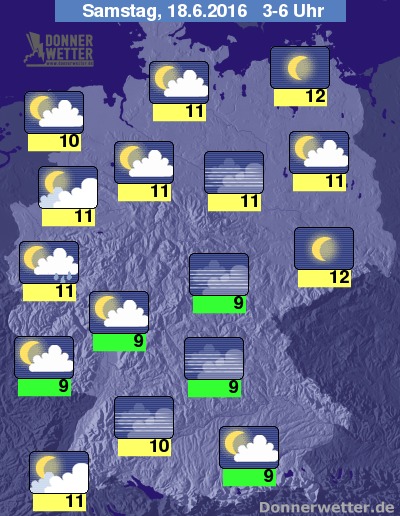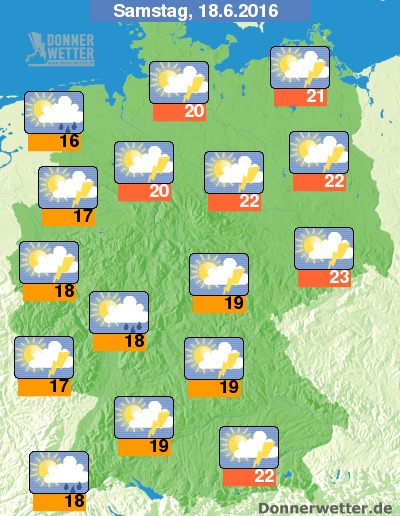 Am Samstag scheint besondern am Vormittag über weiten Landesteilen die Sonne und bis auf vereinzelte Schauer über der Westhälfte ist es auch noch trocken. Bereits am frühen Mittag bilden sich jedoch gebietsweise und zum Teil kräftige Schauer und Gewitter. Die Temperatur steigt auf 16 Grad an der Nordsee und um 23 Grad in der Niederlausitz.