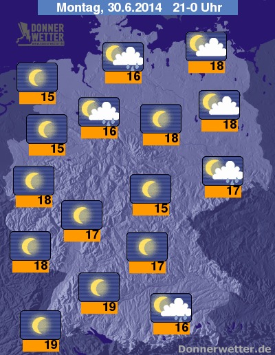 Am Abend reißt der Himmel meist auf und die Schauer klingen vielfach ab, so dass es im Nachfolgenden weitgehend trocken bleibt. Dazu ist es besonders in der Südwesthälfte Deutschlands oft sternenklar. Die Abendwerte liegen bei 19 Grad im Breisgau und 15 Grad entlang der Ems.