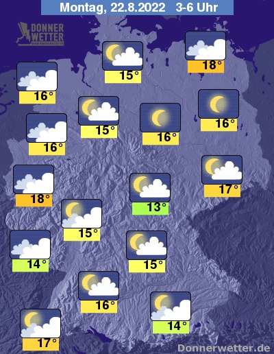 In der Nacht zum Montag zeigt sich der Himmel über der Republik zumeist locker bis aufgelockert bewölkt. Von der Mitte des Landes bis in den Osten ist es oft sternenklar. Entlang von Rhein und Ems ist der Himmel oft dicht bewölkt. Es bleibt landesweit trocken bei Tiefstwerten von 18 Grad in Köln und 13 Grad in Jena.