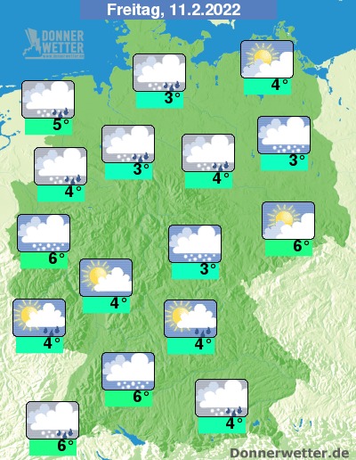 Am Freitag zeigen sich teils Aufheiterungen, oft ziehen jedoch dichte Wolken übers Land hinweg, dabei bilden sich einzelne Schnee-, Schneeregen-, Regen- oder Graupelschauer. Die Temperatur steigt auf 3 Grad in Erfurt und bis 6 Grad in Stuttgart. An der See herrscht zum Teil Sturm.