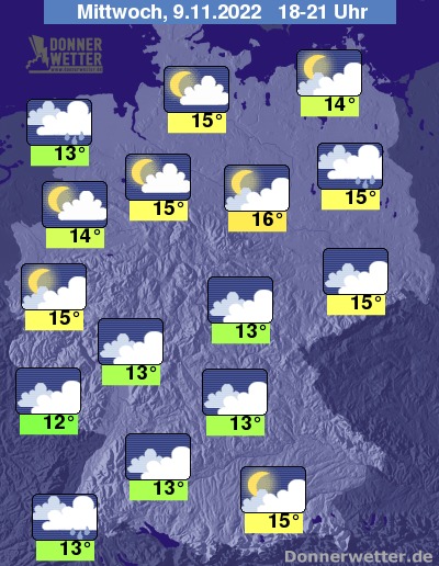 Am Donnerstag zeigen sich zum Teil Aufheiterungen, oft ist es aber auch stark bewölkt oder trüb. An den Alpen bilden sich einzelne Schauer, während es sonst verbreitet trocken bleibt. Die Temperatur steigt auf 11 Grad in Jena und bis 15 Grad in Bonn. An den Küsten ist es zum Teil stürmisch.