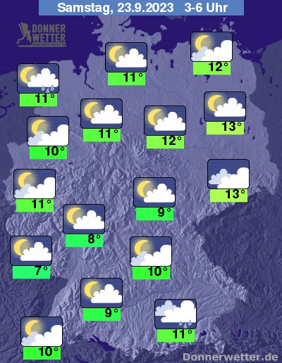 In der Nacht zum Samstag ziehen im Nordwesten oft kompakte Wolken durch und hier können sich sowohl Schauer als auch örtliche Gewitter entwickeln. im Alpenvorland fällt aus dichten Wolken oft leichter Regen. Im übrigen Land ist es teils stark, zunehmend aber auch locker bewölkt, dazu bleibt es weitgehend trocken. Die Temperatur sinkt auf 13 Grad in Berlin und bis 7 Grad in Saarbrücken.
