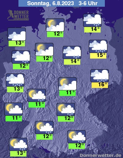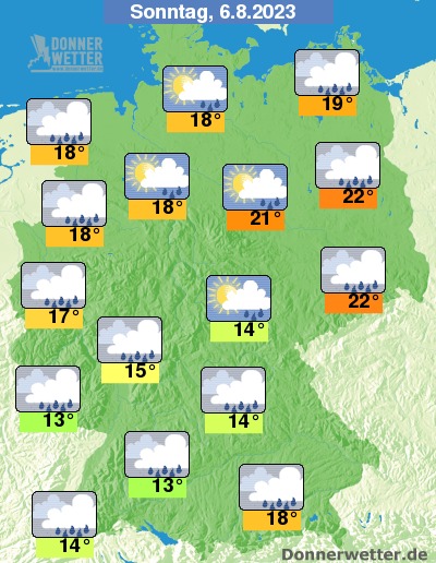 Am Sonntag ziehen überwiegend viele und oft dichte Wolken durch, dabei bilden sich wiederholt Schauer, selten können auch Gewitter auftreten. Erst gegen Abend klingen die Niederschläge von Westen her nach und nach ab und es kann auflockern. Die Temperatur steigt auf teils nur 13 Grad am Pfälzer Wald und bis 22 Grad in der Lausitz.