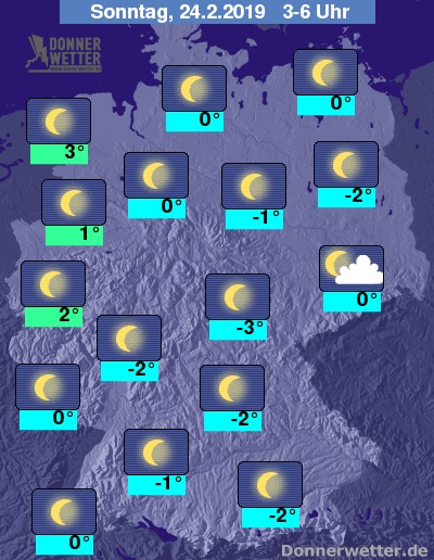 In der Nacht zum Sonntag zeigt sich der Himmel verbreitet sternenklar und lockere Wolken bleiben eher selten, dazu bleibt es trocken. Die Temperatur sinkt auf 3 Grad im nördlichen Emsland und bis -3 Grad im Eichsfeld.