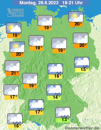 Heute Abend bleibt es vom Süden bis nach Sachsen bei weitgehend dichten Wolken und es fällt auch noch zeitweise Regen. Weiter nach Nordwesten hin ist es teils stark, teils aufgelockert bewölkt und dazu trocken. Die Temperatur liegt bei 13 Grad in München und bis 21 Grad in Köln.