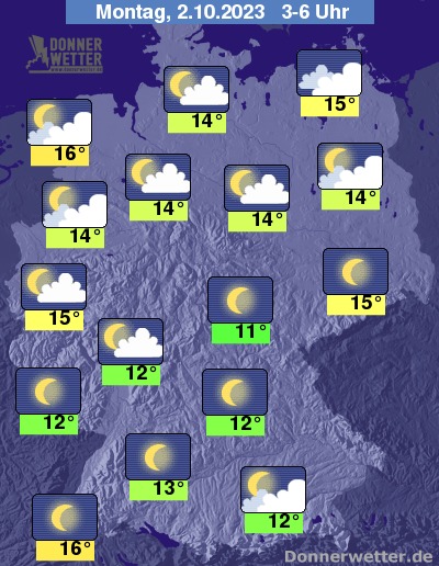 In der Nacht zum Montag ziehen in Küstennähe oft kompakte Wolken durch und hier können sich einzelne Schauer bilden. Im übrigen Norden ist es teils locker, teils stärker bewölkt, aber trocken. Im großes Rest des Landes ist der Himmel meist locker bewölkt und über der Südhälfte meist sternenklar, dazu bleibt es trocken. Die Temperatur sinkt auf 16 Grad in Freiburg und etwa 11 Grad in Jena.