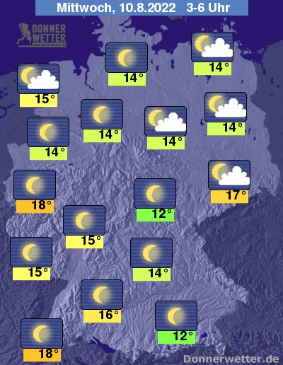In der Nacht zum Mittwoch ist es überwiegend sternenklar, vor allem im Osten und Nordosten ziehen auch lockere Wolkenfelder durch. Es bleibt bundesweit trocken bei Tiefstwerten von 18 Grad in Köln und etwa 12 Grad in Augsburg.