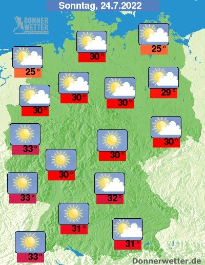 Am Sonntag ist es verbreitet sonnig oder nur gering bewölkt. dabei bleibt es trocken. Die Temperatur erreicht 25 Grad entlang der Küsten und bis 33 Grad am Rhein.