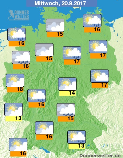 Nach Auflösung von Nebelfeldern entwickeln sich mit sonniger Einstrahlung nochmals mächtigere Haufenwolken, die örtlich Schauer produzieren. Vereinzelt blitzt und donnert es dabei auch wieder. Die Höchsttemperaturen bewegen sich dabei wie in den vergangenen Tagen zwischen 12 und 19 Grad. Der Wind ist meist nur schwach bis mäßig.