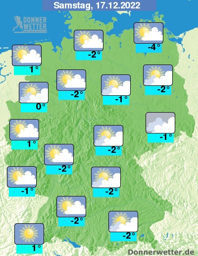 Am Samstag ist es häufig heiter bis sonnig, stellenweise hält sich allerdings Nebel oder Hochnebel, dabei bleibt es trocken. Die Temperatur erreicht -4 Grad in Stralsund und bis 1 Grad in Freiburg.