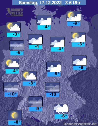 In der Nacht zum Samstag fällt direkt an den Alpen gebietsweise Schnee. Dicht bewölkt ist es auch verbreitet im Osten und Norden Deutschlands, dabei bleibt es meist trocken. Im übrigen Bundesgebiet ist es häufig nur locker bewölkt oder sogar sternenklar, dazu bleibt es trocken. Stellenweise bildet sich Nebel oder Hochnebel. Die Temperatur sinkt auf -3 Grad an der Nordsee und bis -10 Grad in Mittelfranken.