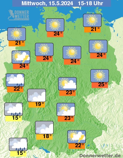 In den Nachmittagsstunden zeigt sich der Himmel über dem Süden und Westen Deutschlands wechselnd oder stark bewölkt; dabei ziehen vom südlichen Baden-Württemberg aus teils schwere Gewitter auf, die nordwestwärts ziehend in den Folgestunden auch Rheinland-Pfalz, das Saarland und das südwestliche Hessen erreichen. Lokal ist hier mit Starkregen, in Gewittern auch stürmischen Böen und kleinkörnigem Hagel zu rechnen. In den nördlichen und östlichen Landesteilen bleibt es bei viel Sonnenschein trocken.