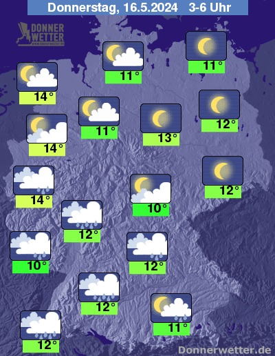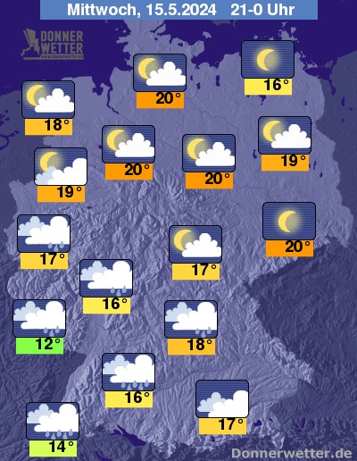 In der Nacht auf Donnerstag ist der Himmel über dem Süden, Westen und Südwesten stark bewölkt und es muss gebietsweise mit teils kräftigem Regen gerechnet werden; vor allem eingangs der Nacht auch noch mit kräftigen Gewittern. In den übrigen Landesteilen ist es sternenklar oder nur gering bewölkt und es bleibt niederschlagsfrei.