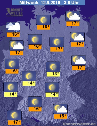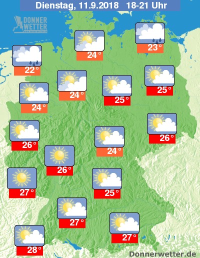 Während der Abendstunden ist es meistens freundlich, im Südwesten auch nur leicht bewölkt. In Küstennähe, sowie in Schleswig-Holstein kann es aus dichteren Schichtwolken zeitweise tröpfeln. Mit Temperaturen von 24 bis 28 zum frühen Abend bleibt es spätsommerlich warm. Unter den Regenwolken ganz im Norden liegen die Temperaturen in der Regel zwischen 20 und 23 Grad.