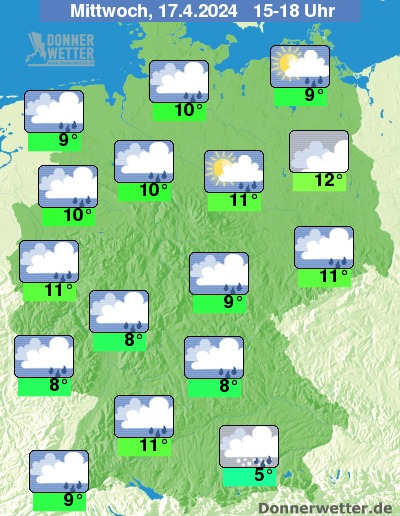 Am Nachmittag zeigt sich der Himmel überwiegend stark bewölkt, Aufheiterungen sind vor allem in der Nordosthälfte möglich. Verbreitet muss am Nachmittag mit Regen- oder Graupelschauern gerechnet werden; in den höheren Lagen Schnee. Auch lokale Gewitter können zur Wochenmitte vor allem in der Süd- und Westhälfte nicht ausgeschlossen werden.