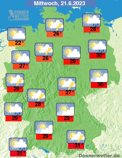 Heute zeigt sich das Wetter zum Großteil heiter oder sonnig. Besonders in den westlichen Landesteilen und am Alpenrand bilden sich oft dichte Quellwolken und mögliche Schauer. Vereinzelt sind auch Gewitter möglich. Im übrigen Land bleibt es zumeist trocken. Die Temperatur erreicht 22 Grad an der Nordsee und bis 31 Grad am Oberrhein.