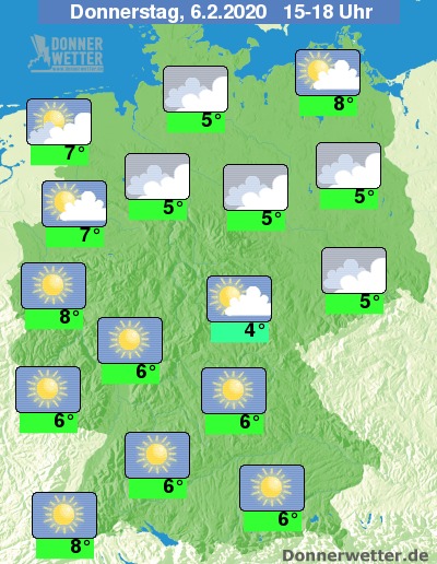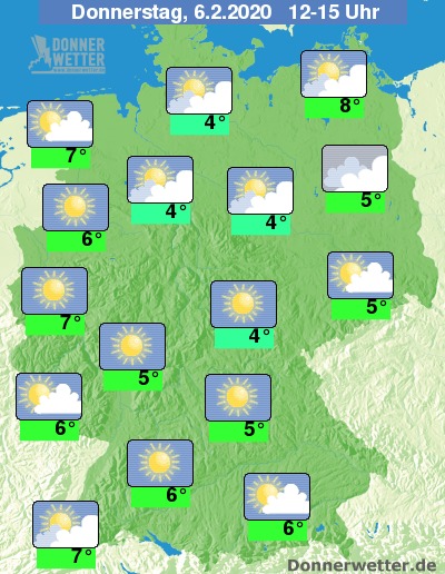Am frühen Nachmittag wechseln sich im Norden Wolken mit Sonne ab, nach Westen hin scheint längere Zeit die Sonne, im Osten dominieren eher die Wolken, Regen fällt aber eher nicht. In den anderen Gebieten herrscht freundliches Wetter mit reichlich Sonnenschein und nur wenigen Wolken.