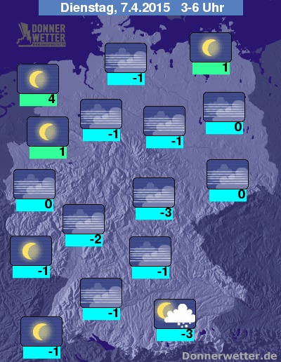 In der Nacht zum Dienstag fällt an den bayerischen Alpen unter oft dichten Wolken noch gebietsweise etwas Schnee, sonst zeigt sich ein verbreitet sternenklarer Nachthimmel und es bleibt trocken, stellenweise bildet sich Nebel oder Dunst. Die Temperatur sinkt auf 4 Grad an der Nordseeküste und um -3 Grad in München.
