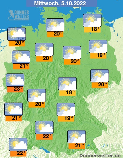 Am Mittwoch ist es teils sonnig, teils ist es aber auch trüb oder stark bewölkt, dabei bleibt es trocken. Lediglich im Umfeld der Nordsee sind einzelne Schauer möglich. Die Höchstwerte erreichen 18 Grad in Rostock und bis 23 Grad in Köln. An der Nordsee weht ein oft stürmischer Wind.