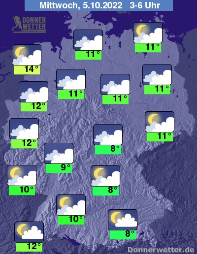 In der Nacht zum Mittwoch zieht sich der Himmel von Nordwesten her mehr und mehr zu, vor allem im Süden und Südosten bleibt es aber anfangs noch meist gering bewölkt. Es bleibt trocken bei Tiefstwerten von 14 Grad in Emden und 8 Grad in München.