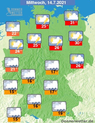 Am Mittwoch halten sich verbreitet dichte Wolken. An der Nord- und Ostsee ist es hingegen oft heiter, teils ziehen hier mehr Wolken durch, aber es bleibt dabei weitgehend trocken. Dagegen fällt über der Südwesthälfte Deutschlands verbreitet, teils langanhaltender, ergiebiger und gewittriger Regen. Im übrigen Bundesgebiet bilden sich örtliche Schauer und Gewitter. Die Temperatur steigt auf 15 Grad am Oberrhein und bis 31 Grad an der Müritz.