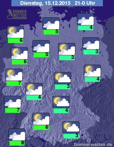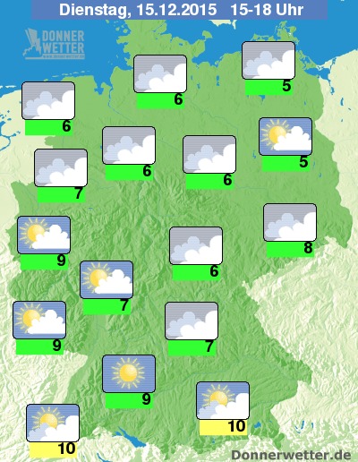 Heute Nachmittag ist es im Süden von Deutschland häufig heiter und zum Teil auch sonnig. Auch im Südwesten und Westen zeigt sich neben den Wolken auch immer wieder die Sonne. Im übrigen Land dominieren hingegen größtenteils dichte Wolken den Himmel und die Sonne schafft es nur hier und da mal durch die Wolken zu strahlen. Es bleibt bundesweit trocken. Die Temperatur steigt auf 5 Grad in Rostock und bis 10 Grad im Oberrheingraben.