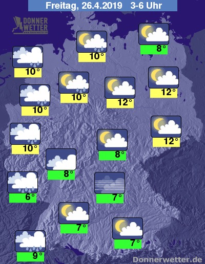 Der Freitag ist im Westen meist grau und verregnet. Im Tagesverlauf muss auch zeitweise mit langanhaltenden Regenphasen gerechnet werden. Im Osten scheint dagegen oft noch lange die Sonne allerdings besteht mit dem Aufzug der Schauerwolken auch Gewittergefahr. Die Temperaturen erreichen kühle 12 Grad im Ostfriesland und bis zu 26 Grad in Brandenburg.