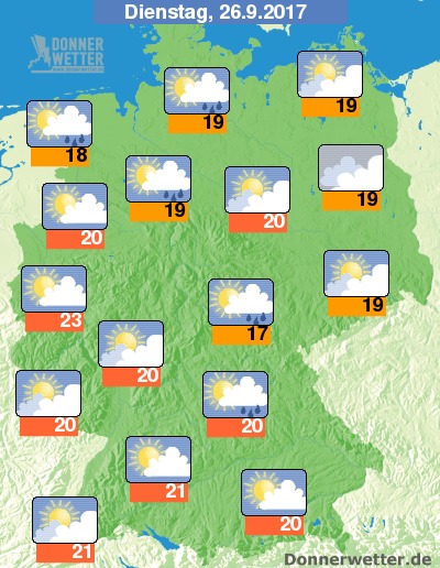 Am Dienstag bleibt es vom Nordosten bis in den Osten des Landes meist bedeckt und es fällt gebietsweise Regen. In den anderen Landesteilen ist es hingegen häufig heiter, teils jedoch auch stärker bewölkt, dazu bilden sich nur örtlich Schauer oder Gewitter. Die Temperatur steigt auf 17 Grad am Thüringer Schiefergebirge und bis 23 Grad in der Kölner Bucht.