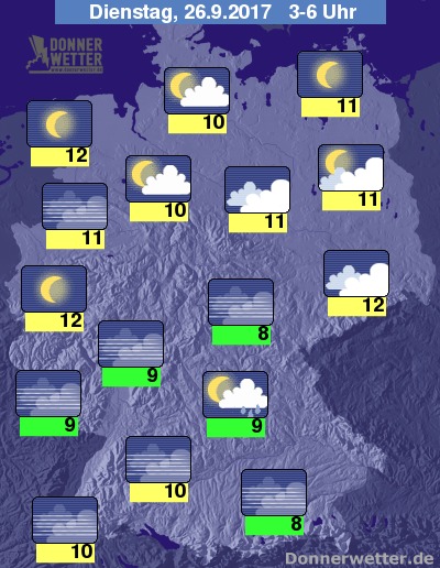 In der kommenden Nacht halten sich vom Bayerischen Wald bis zum Erzgebirge noch häufig dichtere Wolken, die hier anfangs noch einzelne Schauer bringen können. Oft stark bewölkt bleibt es auch im übrigen Osten des Landes, sonst ist der Himmel aber verbreitet nur locker bewölkt oder sternenklar, dazu bleibt es trocken. Die Temperatur sinkt auf 12 Grad in Dresden und bis 8 Grad in München.