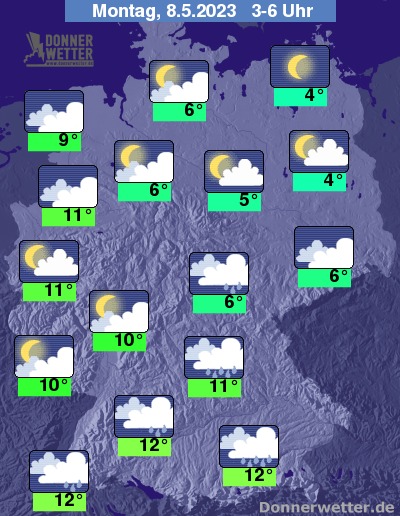 In der Nacht zum Montag fällt im Süden bis ins südliche Thüringen hinein unter dichten Wolken häufig Regen. Weiter nach Norden ist es auch teils stark, oft aber auch wechselnd bis aufgelockert bewölkt, dazu bleibt es trocken. Die Temperatur sinkt auf 12 Grad in Freiburg und etwa 4 Grad in Rostock.