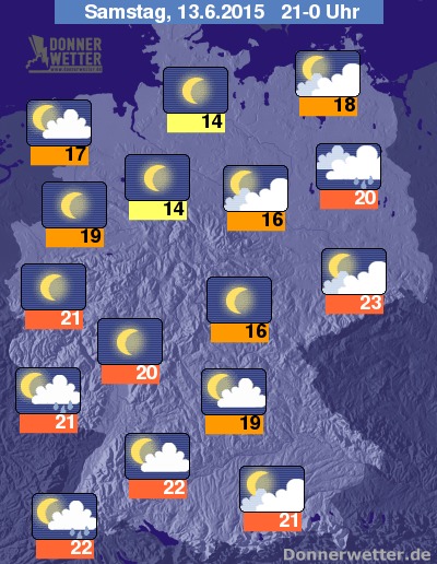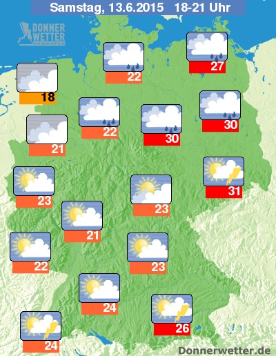 Am Samstagabend beschränken sich Niederschläge vor allem auf den Nordosten des Landes, hier werden mit Temperaturen bis 30 Grad auch die deutschlandweiten Höchstwerte erreicht.