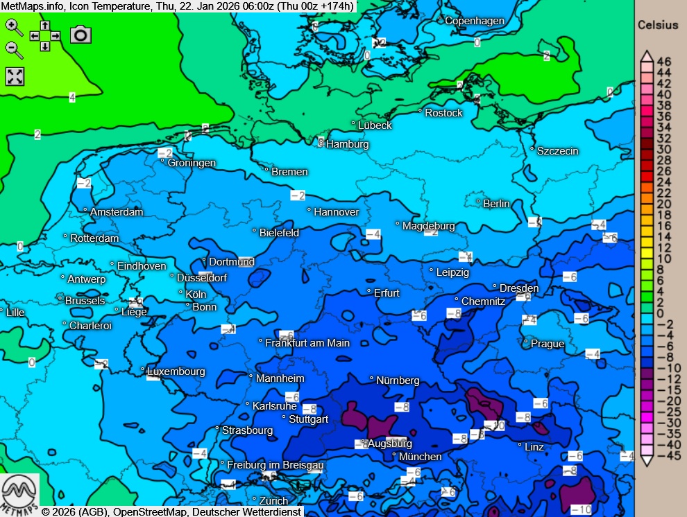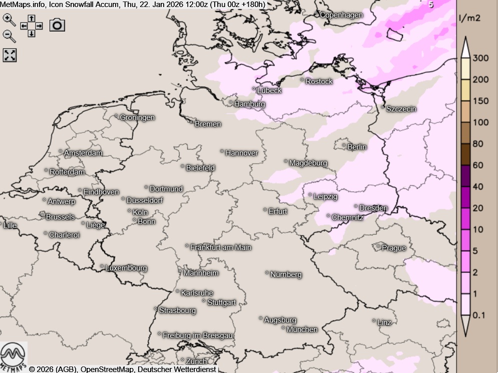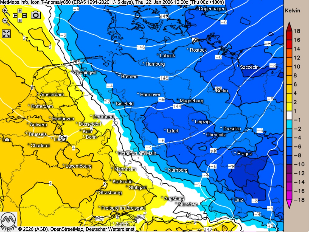 Die Lufttemperaturen und Temperaturanomalie am 22.01.2026 (06:00 / 12:00 Uhr) sowie die akkumulierten Schneemengen bis nächste Woche Donnerstag nach ICON: